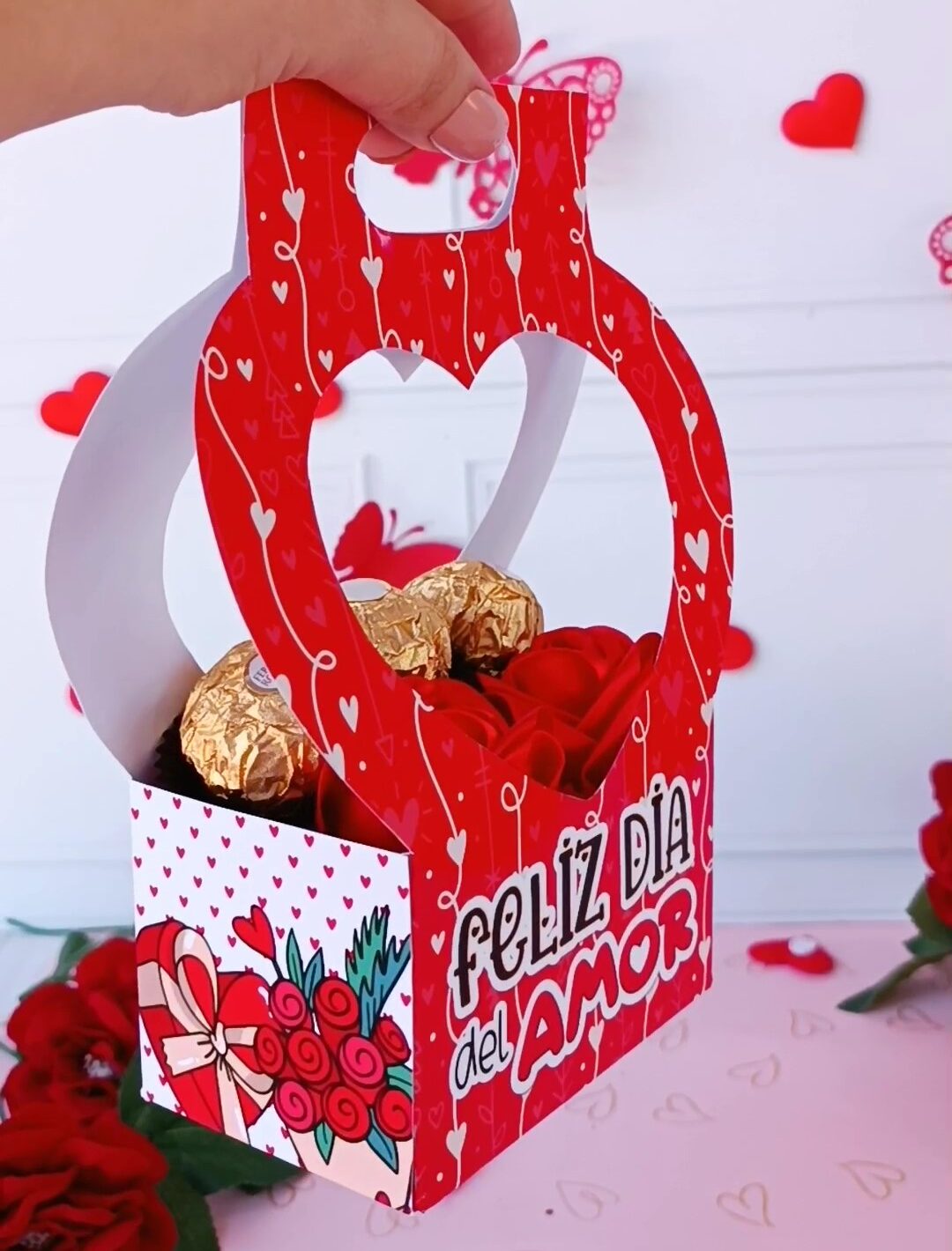 Crea esta canasta con corazón y mensaje “Feliz Día del Amor” ideal para chocolates, rosas o regalos especiales.
